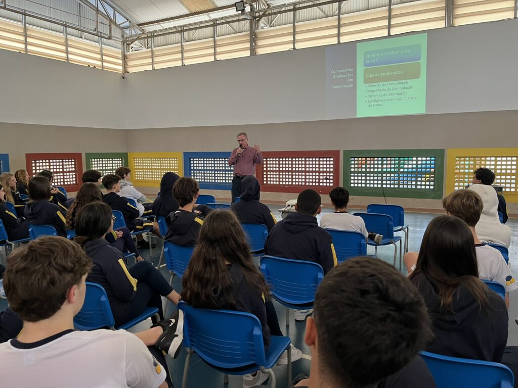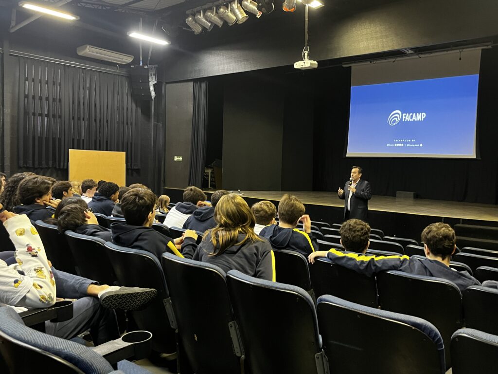 No momento sobre orientação vocacional recebemos representantes da FACAMP, importante universidade de Campinas, fazendo uma explanação sobre os cursos das diversas áreas da Engenharia, além de um curso novo de graduação sobre ciências de dados e inteligência artificial. Recebemos também ex-alunos formados pra discorrer sobre diversos cursos e o mercado de trabalho sobre as áreas apresentadas. Participaram do painel os ex-alunos: Mariana Eugênio formanda em Veterinária USP, Matheus Almeida – Medicina Santa Marcelina, Augusto Neto – Economia INSPER, Mariana Garcia – Psicologia USP.