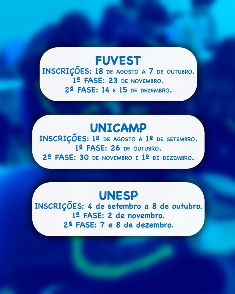 Estão abertas o período de inscrições para os principais vestibulares. Você que está na 3ª série do Ensino Médio ou pretende participar como treineiro, atenção às datas e prazos importantes.