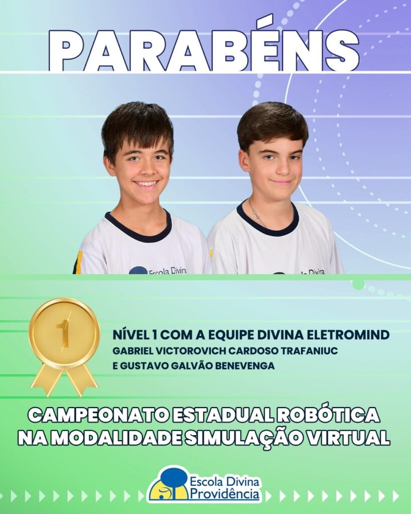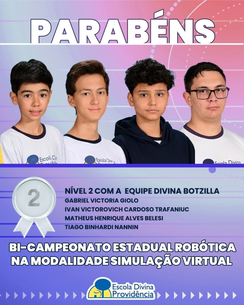 Bi-Campeonato Estadual na modalidade Simulação Virtual – Nível 2, com a equipe Divina Botzilla (Ivan Victorovich Cardoso Trafaniuc, Matheus Henrique Alves Belesi, Gabriel Victoria Giolo e Tiago Binhardi Nannin).